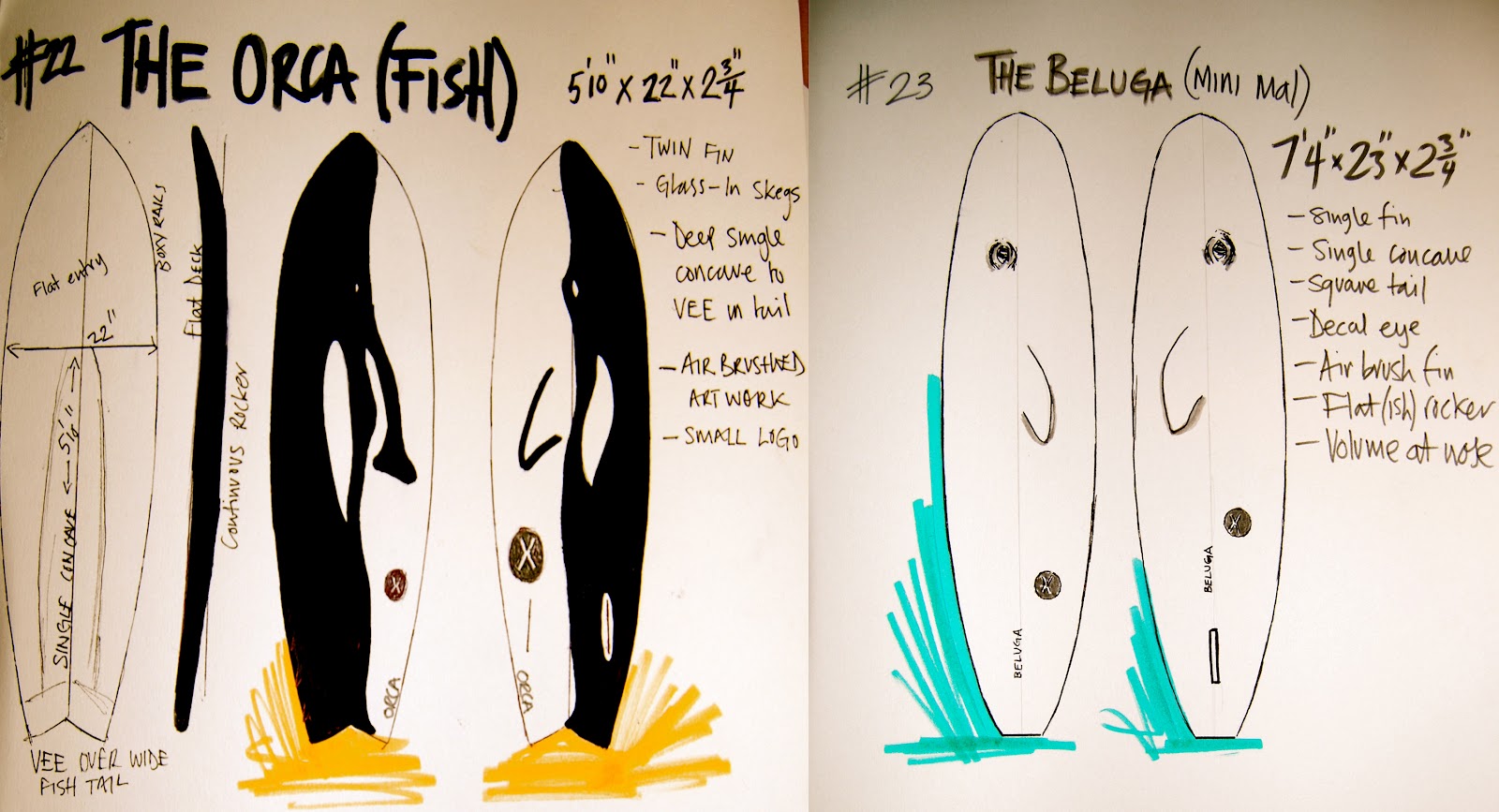 Awaiting sand and spray job... this lil beauty is The Orca - measures 5'10" x 22" x 2.5" with a twin fin set up. Steady continuous rocker with a lot of volume pushed forward so you can ride this chestnut right up on the nose.